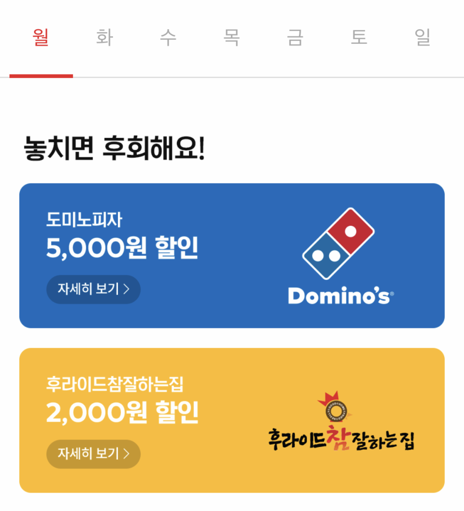 도미노피자 피자헛 걸작떡볶이치킨 유로코피자 티바두마리치킨 등등 (요기요)