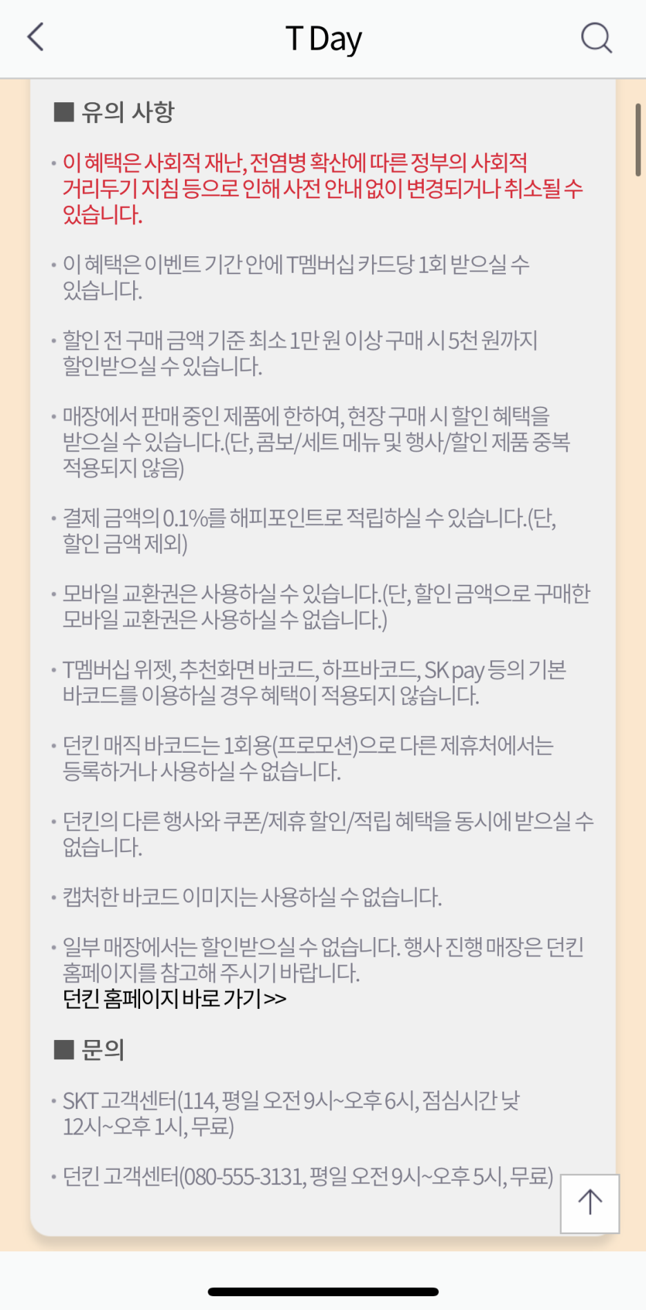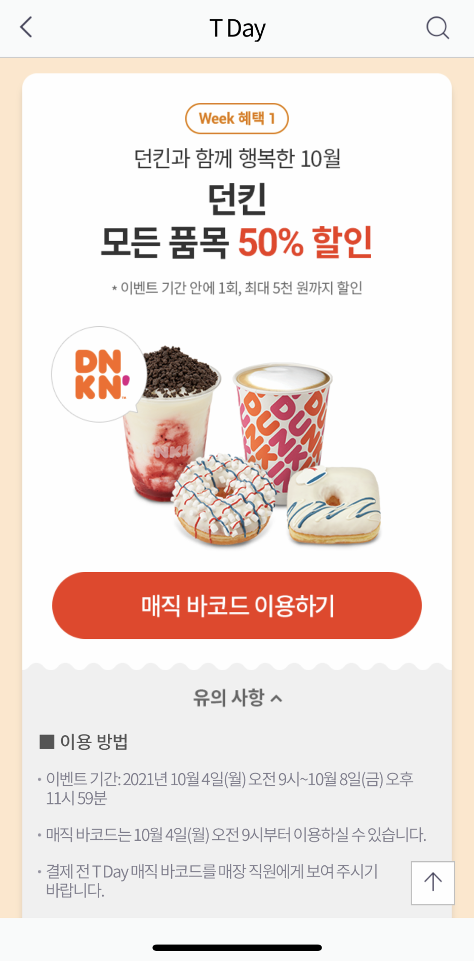 던킨도너츠 모든 품목 50% 할인 (T멤버십 티멤버십)