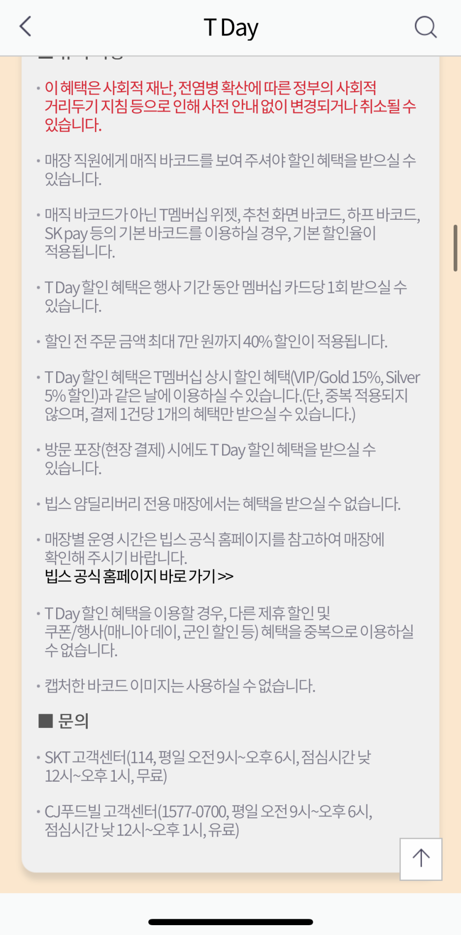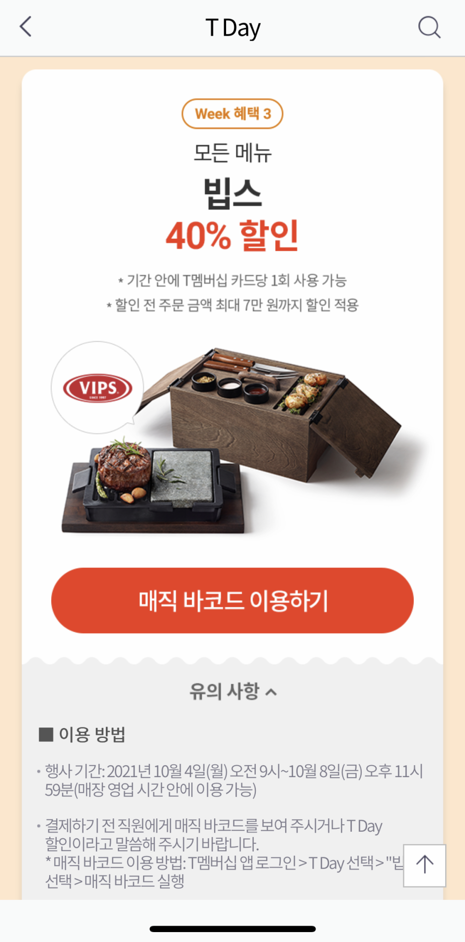 빕스 VIPS 40% 할인 (T멤버십 티멤버십)