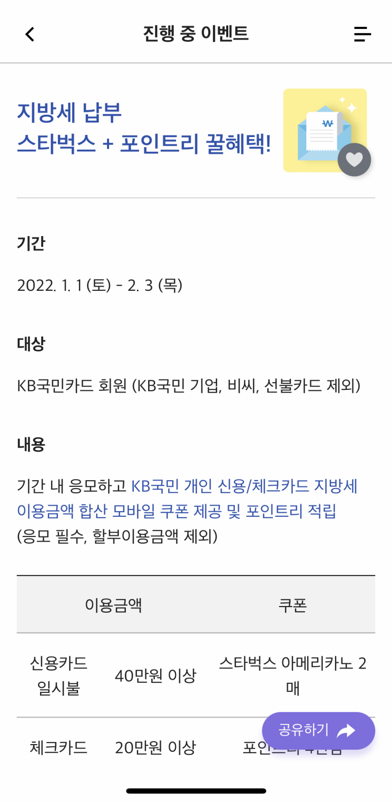 50만원이 부담이 되지 않으신 분은 KB신용카드 일시불 납부시, 아메리카노 2잔 쿠폰을 받으실 수 있습니다. 스타벅스 아메리카노 2잔은 9000원이기 때문에 그냥 납부하시는 것보다 조금은 혜택이 될 것입니다.