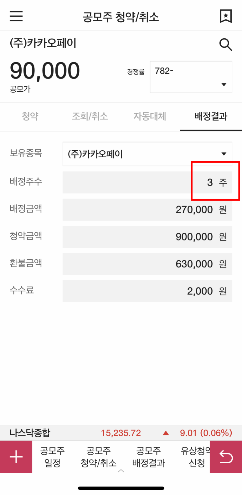 카카오페이 배정수량이 보입니다.