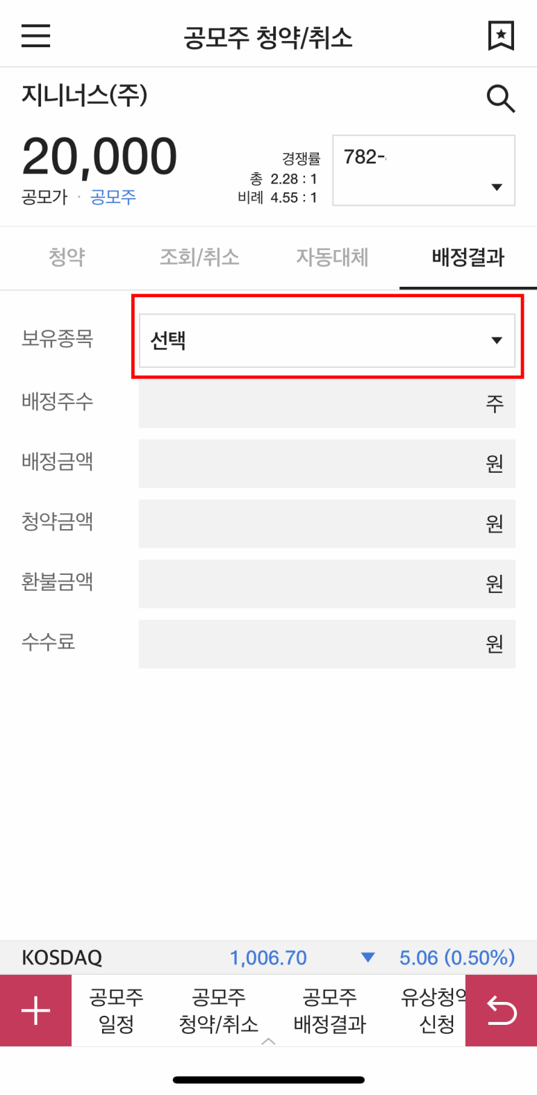 공모주청약 배정결과를 누르고, "공모"라고 검색합니다.