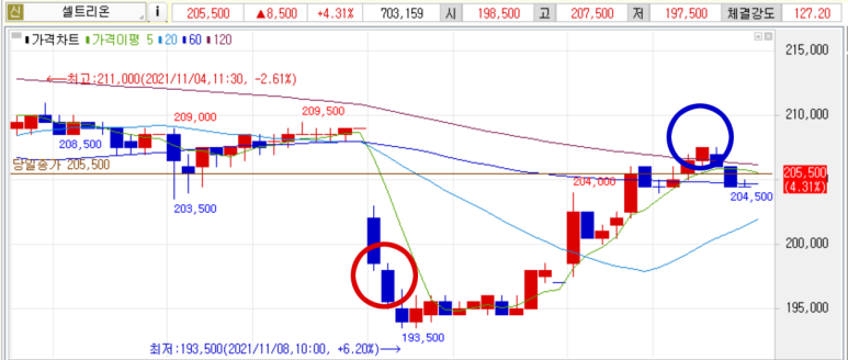 지지선을 체크하며 당일 최고점에 매도를 하며,