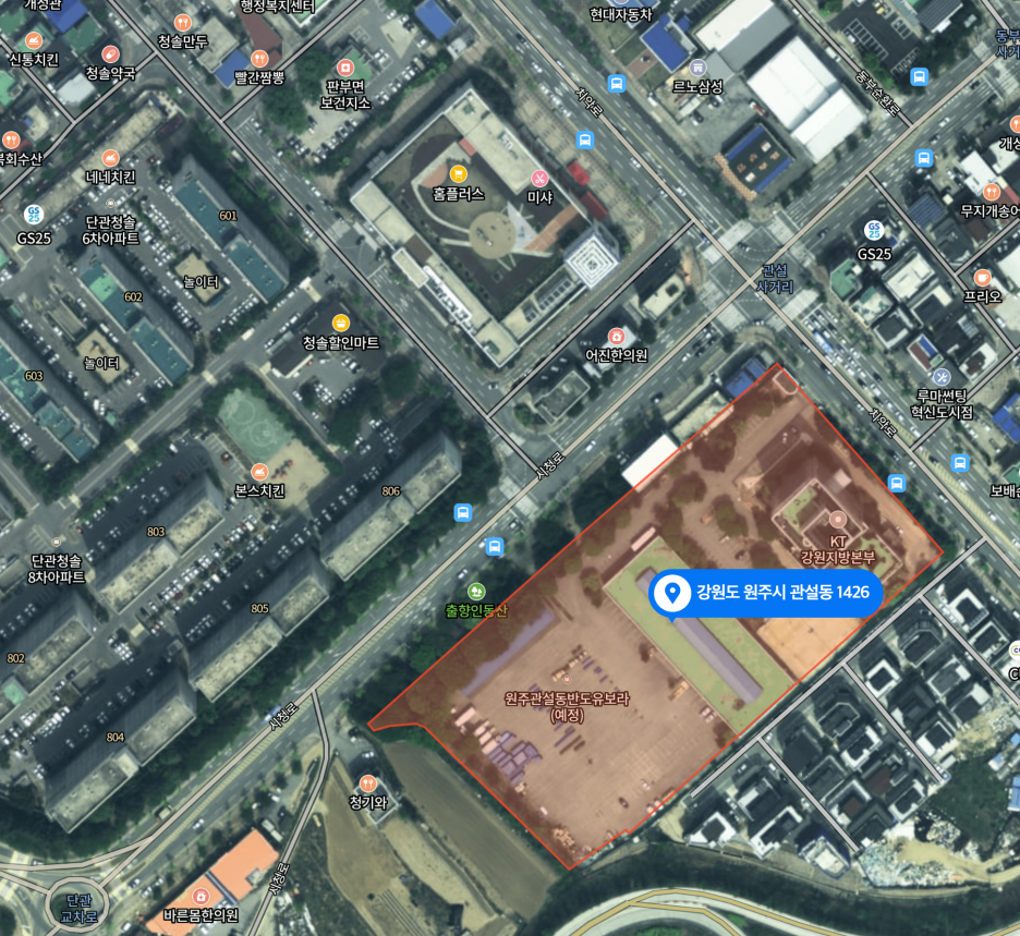 그래도 네이버 지도를 확인하면 어느 아파트가 들어서는지 충분히 유추가 가능합니다. 위치는 강원도 원주시 관설동 1426번지 일원입니다. 원주시민 분들은 많이 아시겠지만 옛 KT부지로, 가장 눈에 두드러지는 인프라는 관설동 홈플러스와 혁신도시 인근(자차이동 5분 거리) 이라는 점입니다.