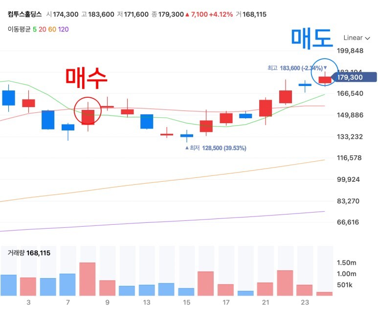 성공한 첫 종목은 컴투스홀딩스, 전 게임빌입니다. 매수할 때는 분명 게임빌이었는데, 매도할 때는 컴투스홀딩스가 되어있네요 ㅎㅎ 덧붙여 스윙 목표는 늘 15~30%를 목표로 하고 있습니다.