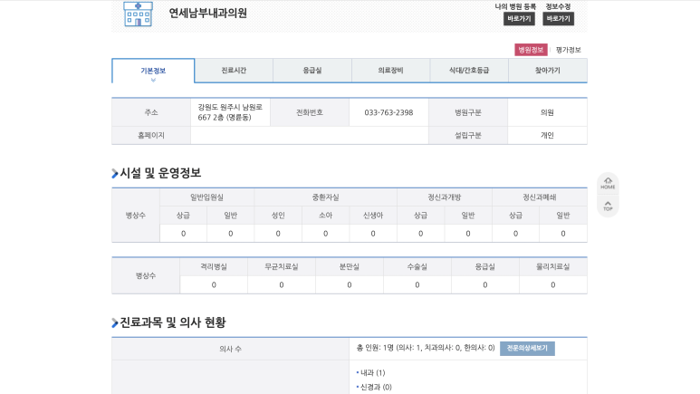 6. 이후 병원명을 클릭하면 위 이미지와 같이, 입원실수 중환자실수 의사수 진료시간 의료장비 등 병원에 대한 상세한 정보를 확인하실 수 있습니다.