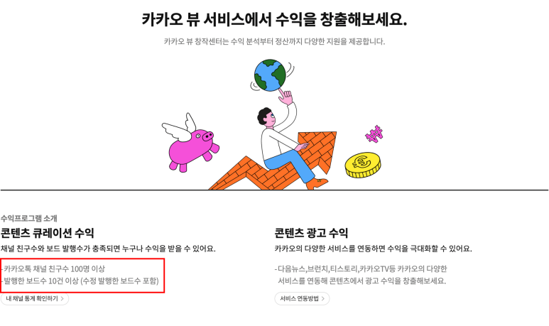 위 이미지는 카카오뷰 수익창출 설명페이지입니다. 수익창출에는 빨간 박스에 보이시는대로 2가지 기준이 있는데요.