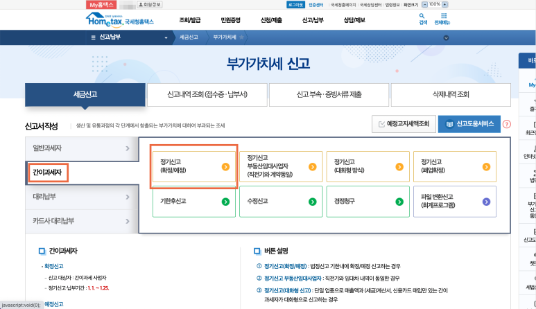 부가가치세 신고 메뉴입니다. 왼쪽 중간부분을 보시면 간이과세자 카테고리가 있습니다. 정기신고(확정/예정)을 클릭합니다.