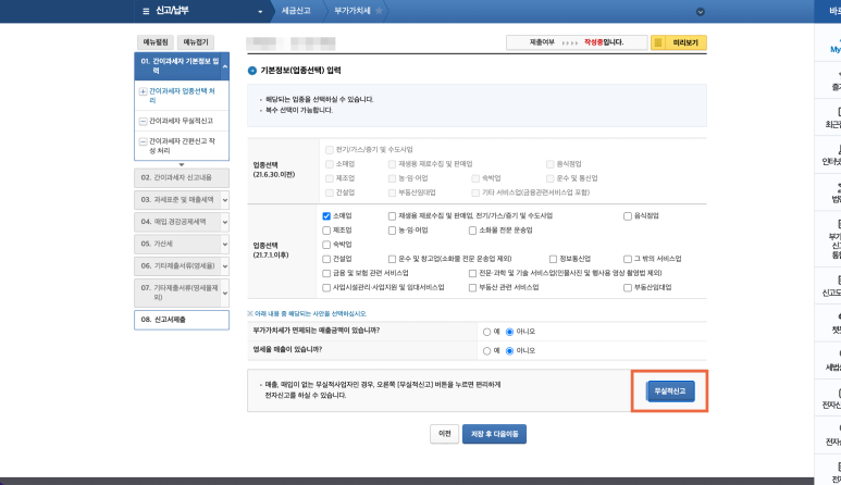주황색 박스를 보시면 우리가 찾던 무실적신고 항목이 하단에 보입니다. 클릭합니다.