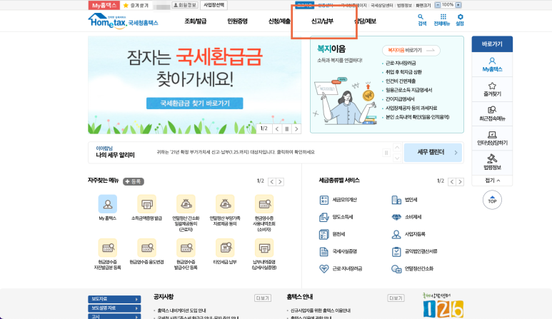 먼저 위 링크를 클릭하여, 국세청 홈택스에 접속을 합니다. 상단 메뉴를 보시면 주황색 박스에 위치한 신고/납부를 클릭합니다.