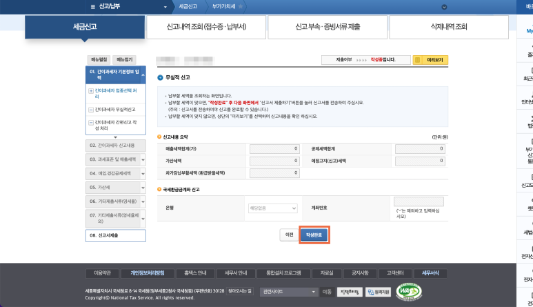 무실적신고 항목입니다. 사업 수익과 그로 인해 납부할 세금이 없기 때문에 모든 항목이 0 으로 입력되어있습니다. 확인하셨으면 작성완료를 클릭합니다.