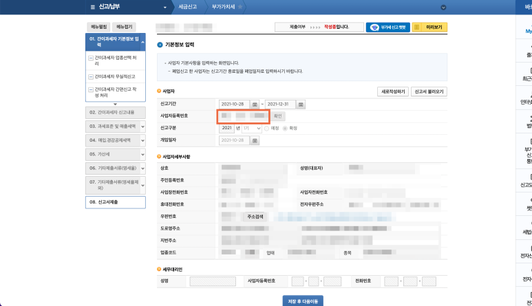 주황색 박스에 보이는 항목은 사업자등록번호 입력란입니다. 사업자등록번호를 입력하시면, 자동으로 모든 공란에 사업자 정보가 입력됩니다. 모든 정보가 입력되면 저장 후 다음이동을 클릭합니다.